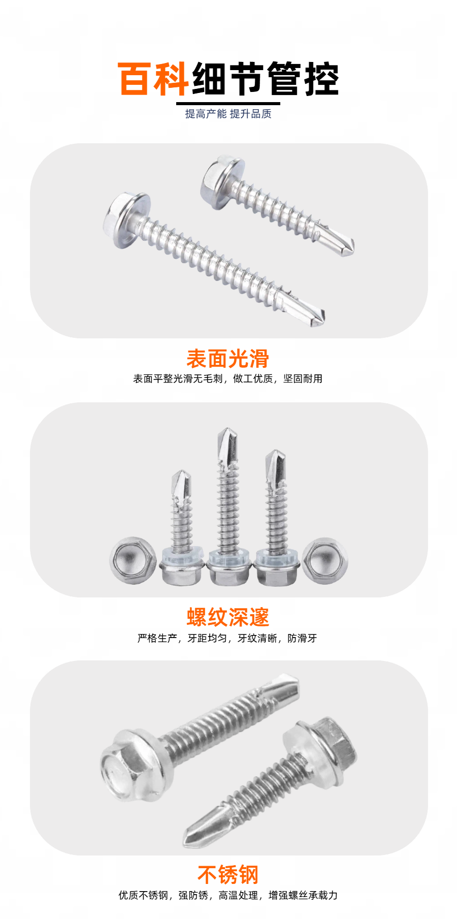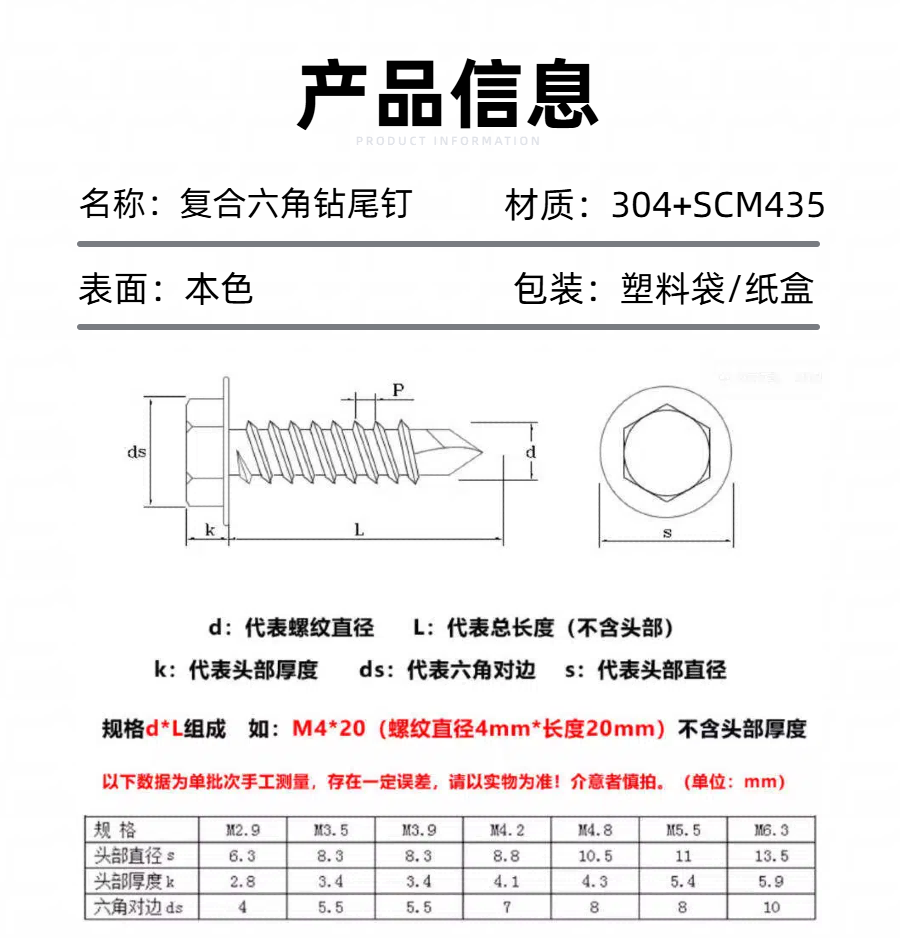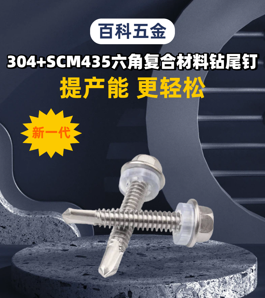 百科五金专注于生产304+SCM435六角复合材料钻尾钉,支持非标定制服务,适用于各种工业场景。产品规格齐全,如有需求,欢迎致电联系。
