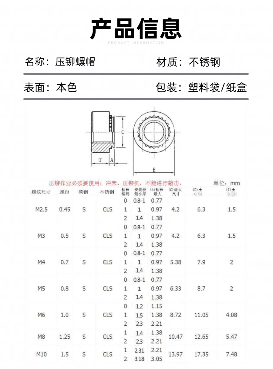 百科五金专注于生产不锈钢压铆螺母,专为金属薄板提供内螺纹解决方案。产品规格多样,支持非标定制,欢迎来电咨询。