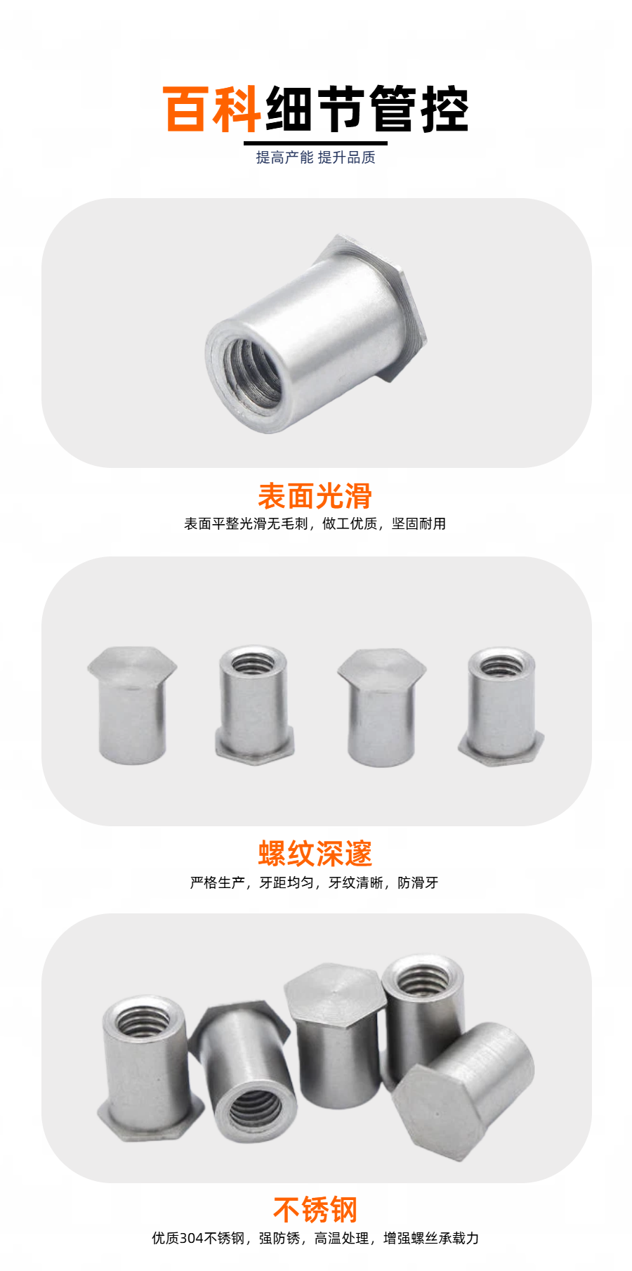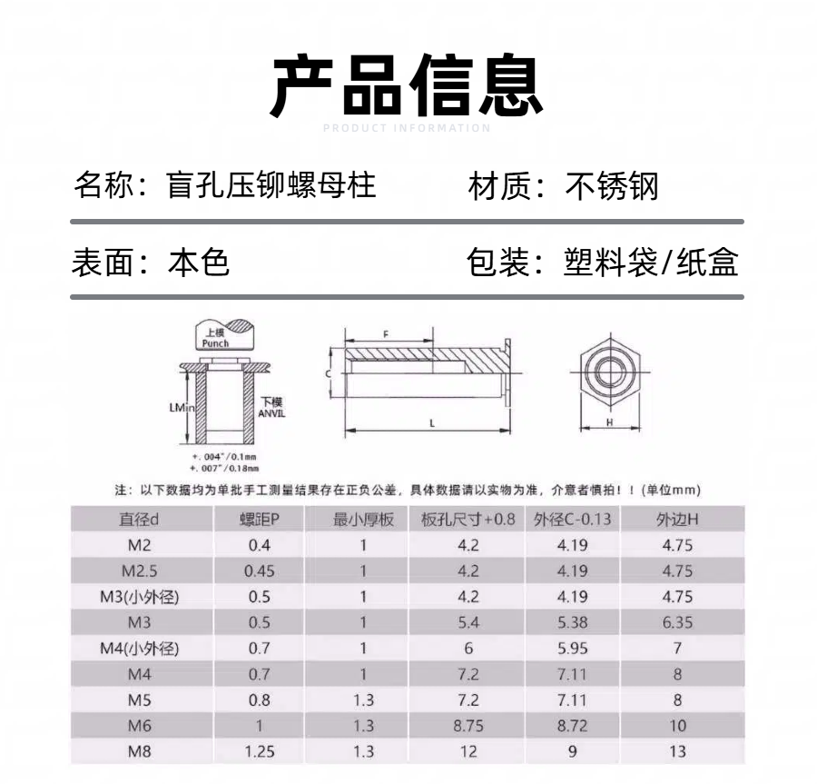 百科五金专注于生产不锈钢盲孔压铆螺母柱,产品提供多种规格并支持非标定制,适用于多种板材的坚固内螺纹连接,如有需求,欢迎致电联系。