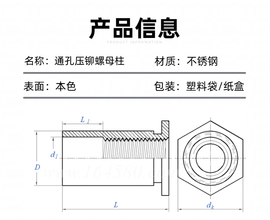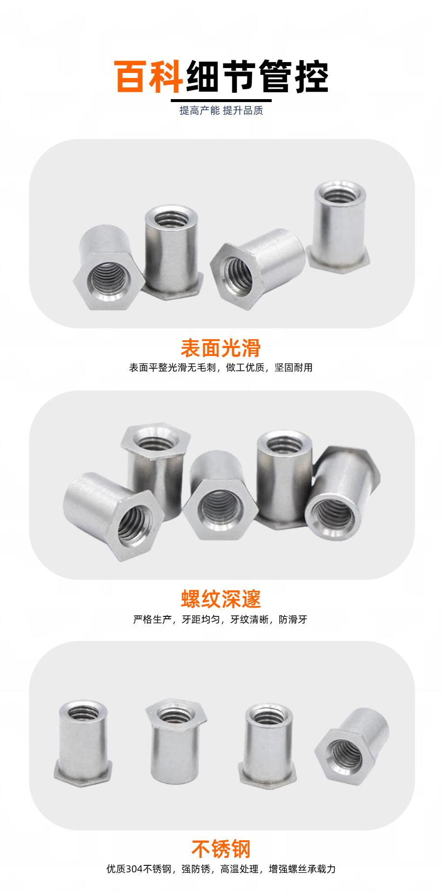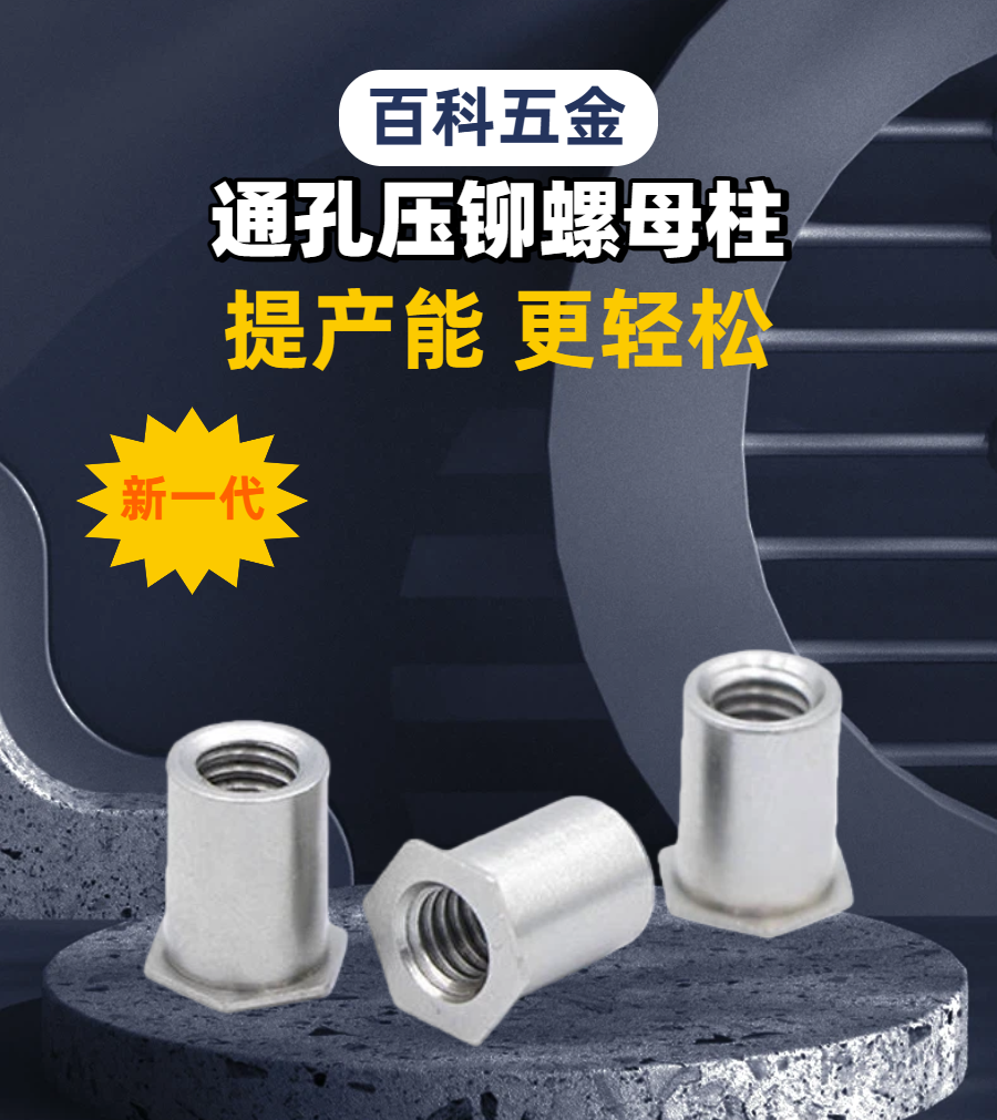 百科五金专注于生产不锈钢通孔压铆螺母柱,适用于各类金属板材,产品支持多种规格与非标定制,如有需求,欢迎致电联系,获取报价方案。