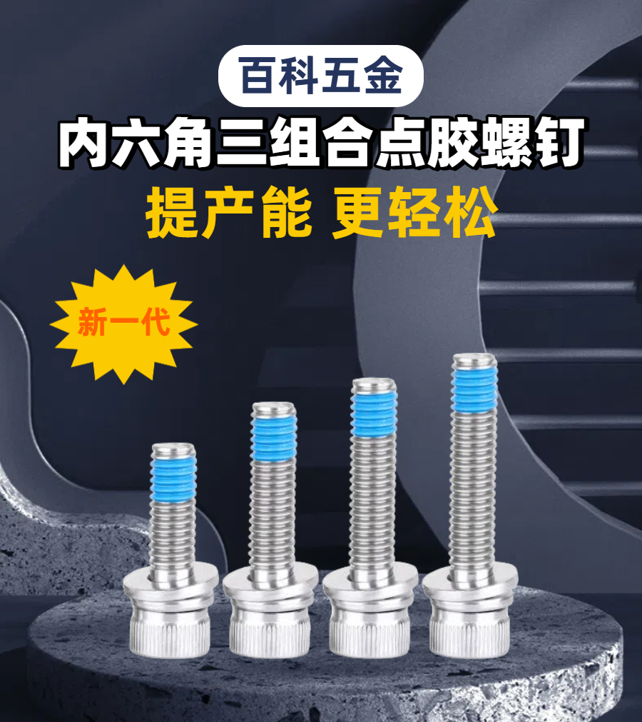 百科五金生产的内六角圆柱头三组合点胶螺钉,选用了不锈钢材质,采用预点胶工艺,有助于增强防松抗震性能,支持异型定制,欢迎致电咨询。