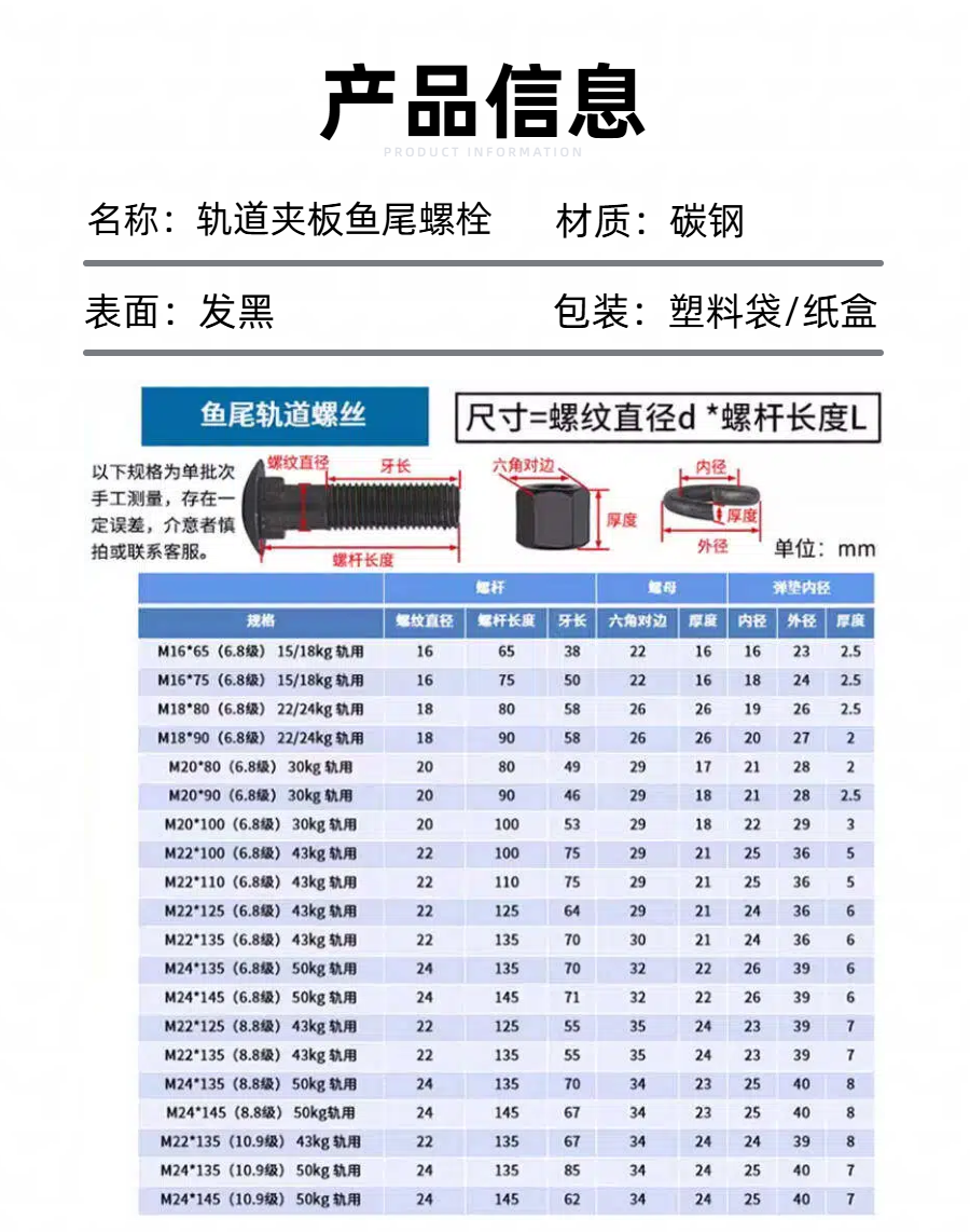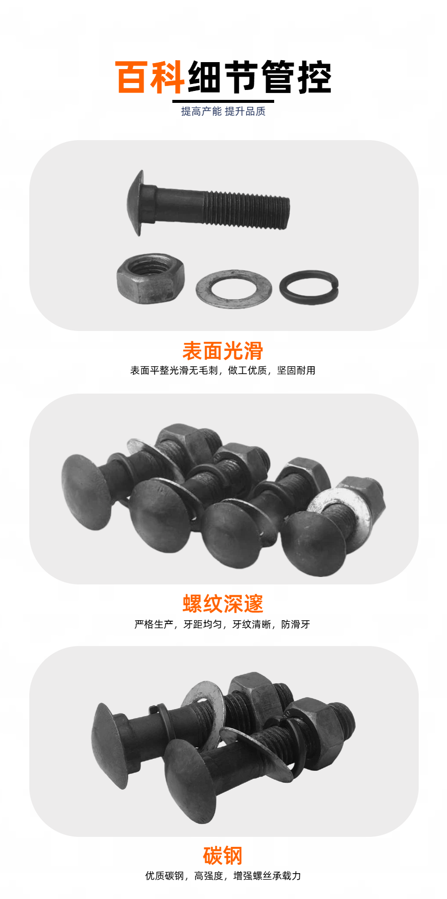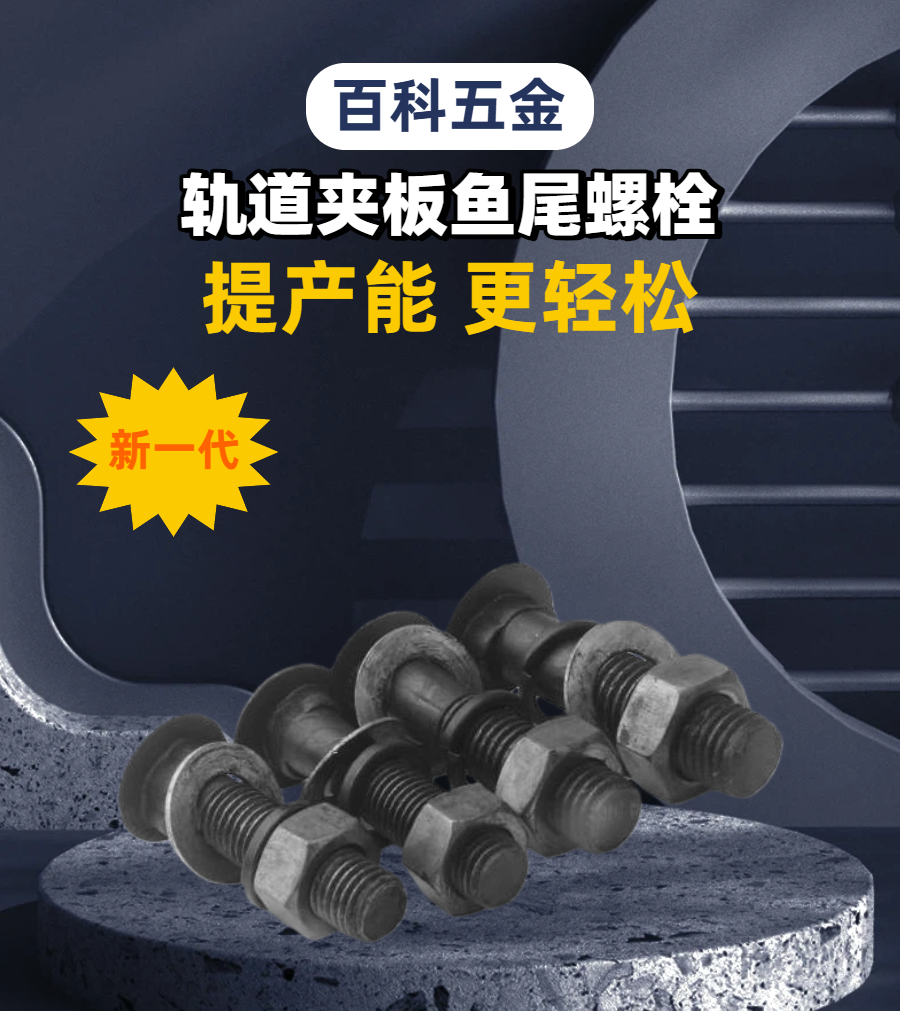 百科五金专注于生产轨道夹板鱼尾螺栓,用于钢轨连接固定,抗冲击性能好,产品规格多样,支持非标定制,如有需求,欢迎来电咨询。